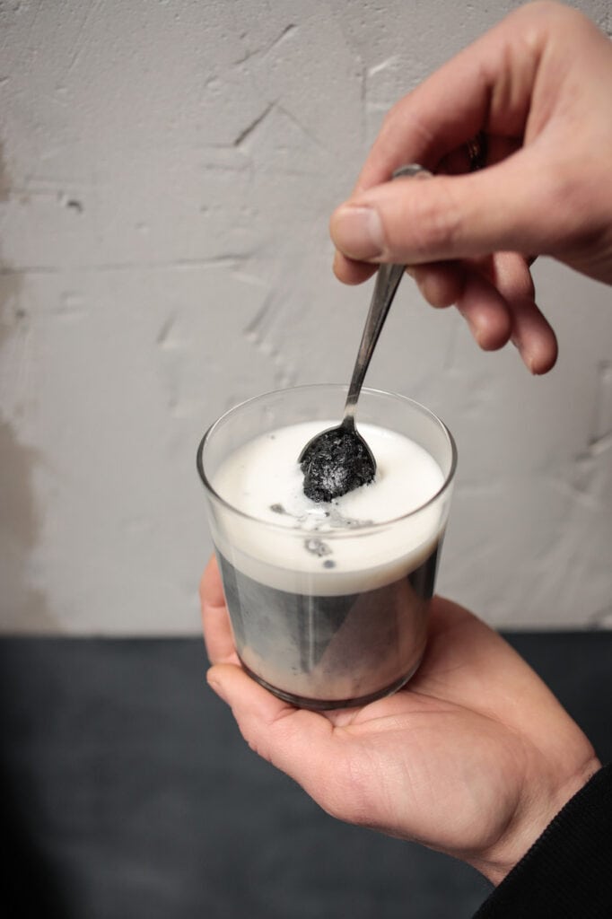 Sésame noir, sirop de datte, sirop d’agave, charbon végétal actif, beurre de cacao extrait à froid, gingembre frais, poivre noir.